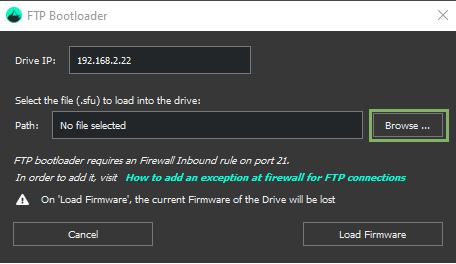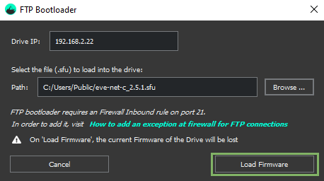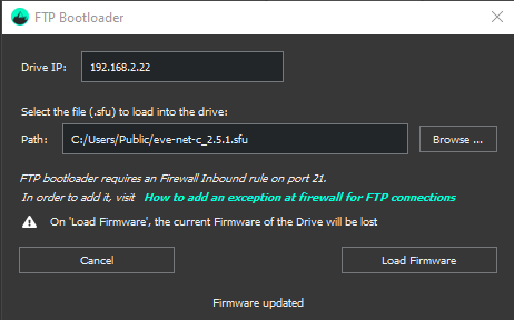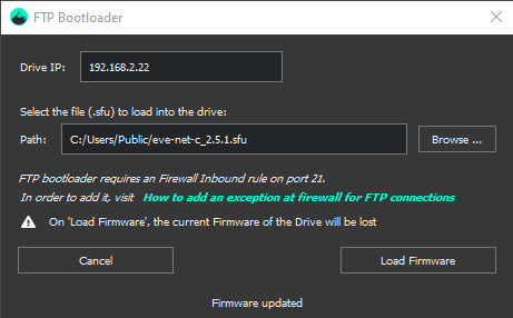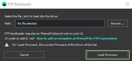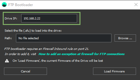 If you firmware update procedure has failed and you are no longer able to scan the drive in MotionLab3, then it is most likely that the public firewall in your computer was not disabled and this caused the update process to crash. In this case, proceed to disable the public firewall and repeat the FTP bootloader directly (without the trying to connect to the drive) and you should get to recover the drive with the firmware version that you wanted to update in the first and without any configuration parameter being lost.