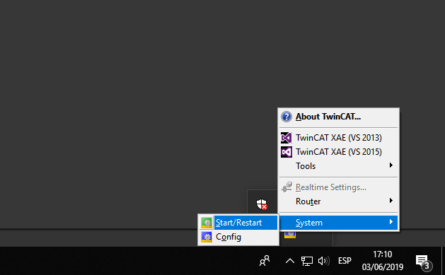 Restart TwinCAT System in bottom Windows menu, right-click in the TwinCAT icon → 'System' → 'Start/Restart'.
