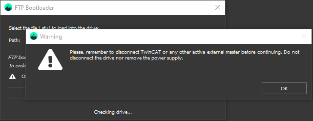 Take into account that when updating to EtherCAT, it is possible that the FTP Bootloader tool might be a "timeout occured during reboot" message after the firmware has been updated correctly. Do not get confused, this is normal (MotionLab3 is trying to ping the drive directly but with EtherCAT firmware this is not possible). In the same way, you cannot connect to the drive directly through MotionLab3 either and you need to use an EtherCAT master for it. Make sure to verify that the firmware was installed successfully. You can now connect through your EtherCAT master.