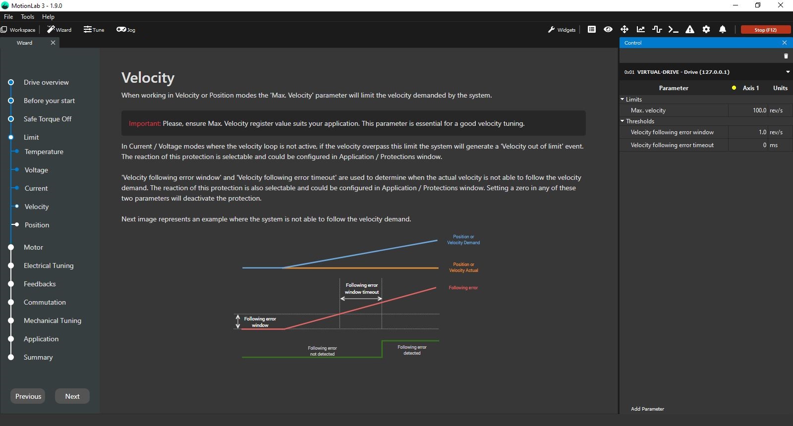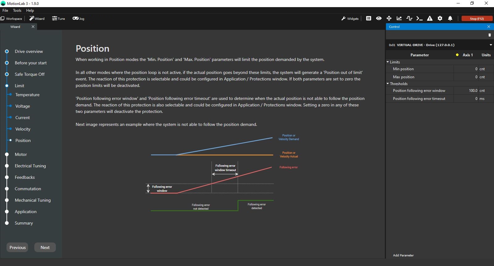 These steps are used to design the safety limits in order to protect the motor. All these parameters are set in the Control widget.
