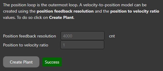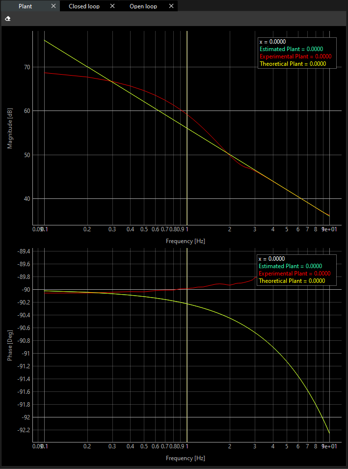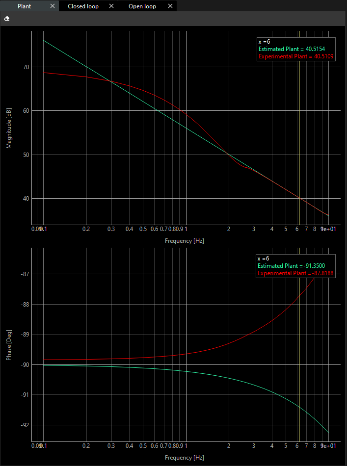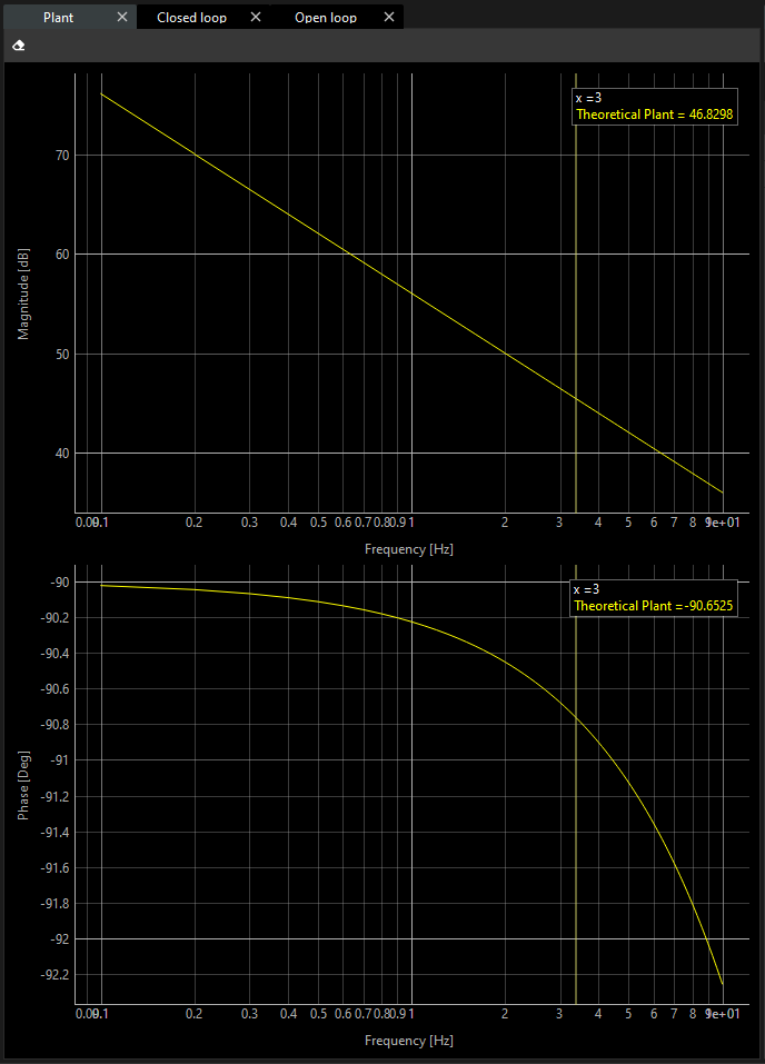 If the plant is created successfully, the theoretical plots in the magnitude and phase charts in the frequency domain are presented based on the type of model (ideal integration or gear), feedback resolution and friction.