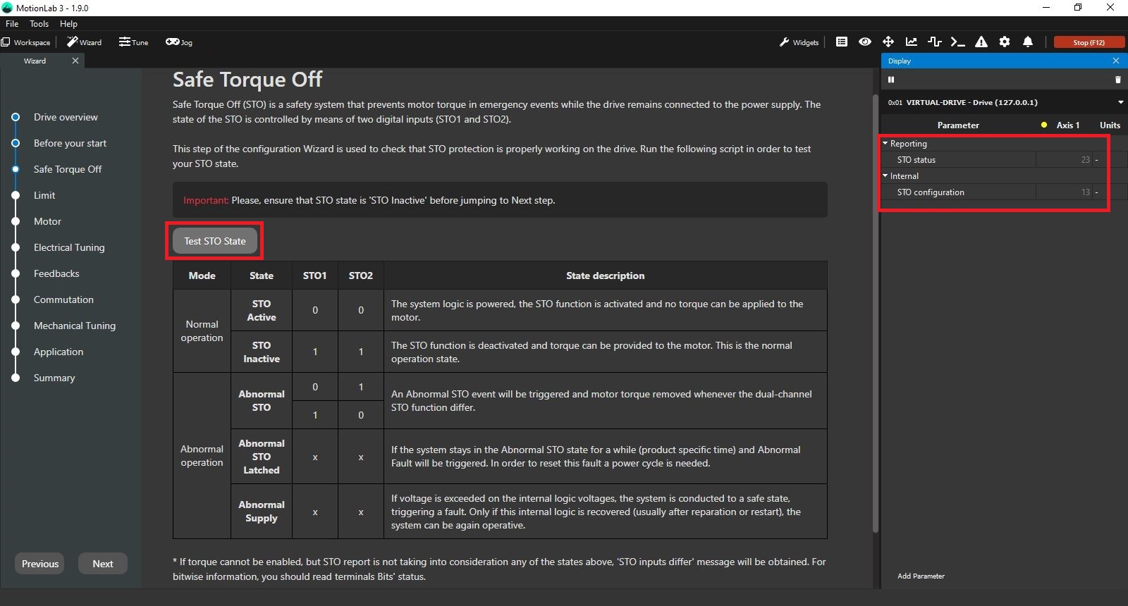 This STO checking is done with the "STO TEST" button shown in the picture below which basically is checking some registers on the firmware that are reporting the state of STO1 and STO2 inputs: