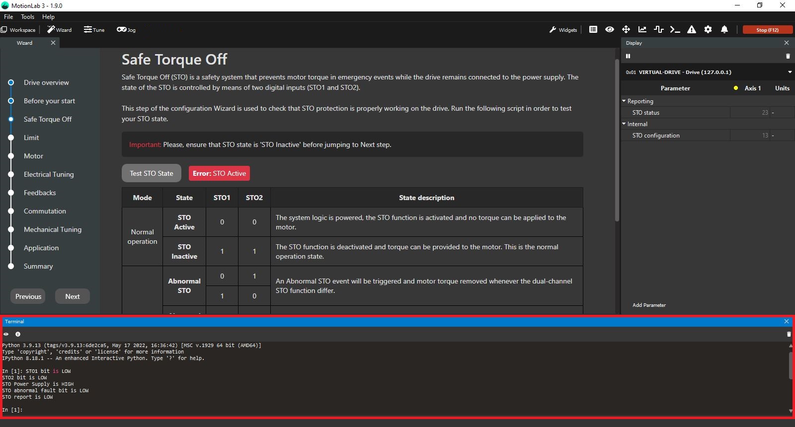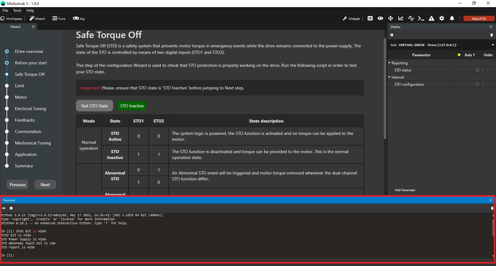 This step of the configuration Wizard is used to check that the drive's safe torque off (STO) hardware protection is properly powered on.