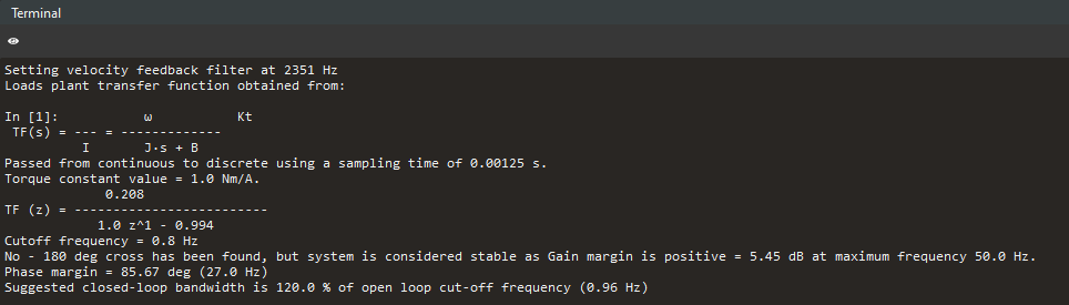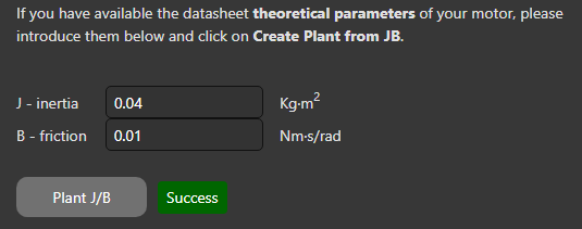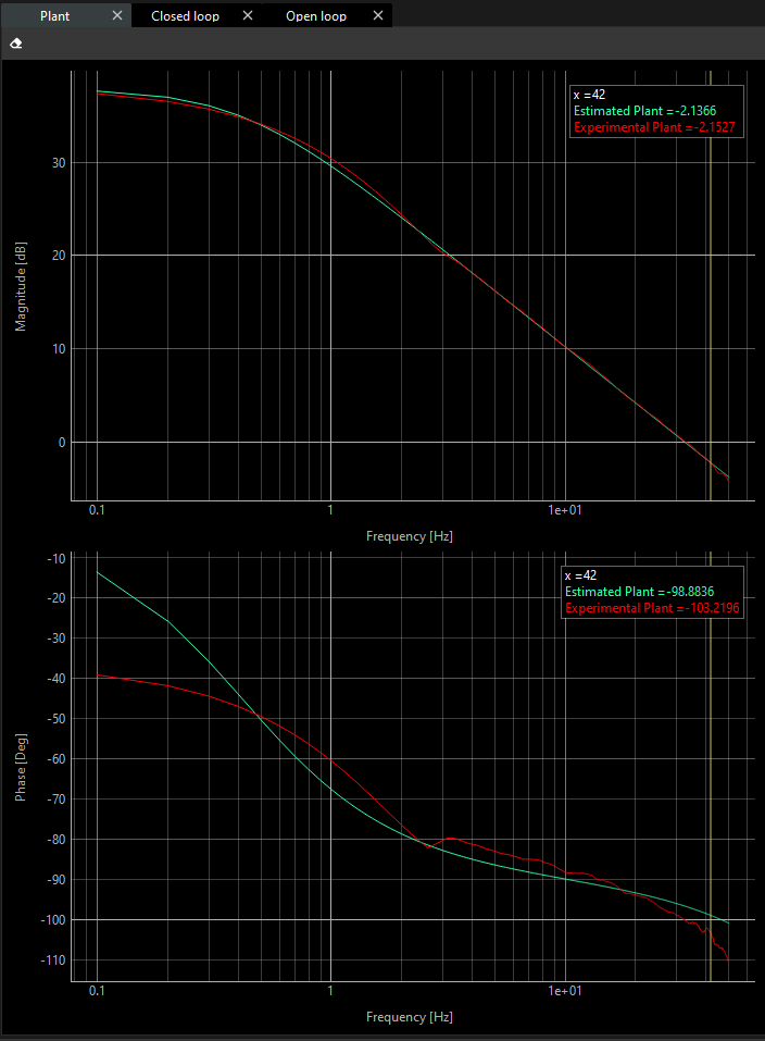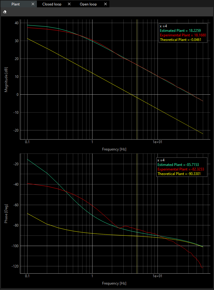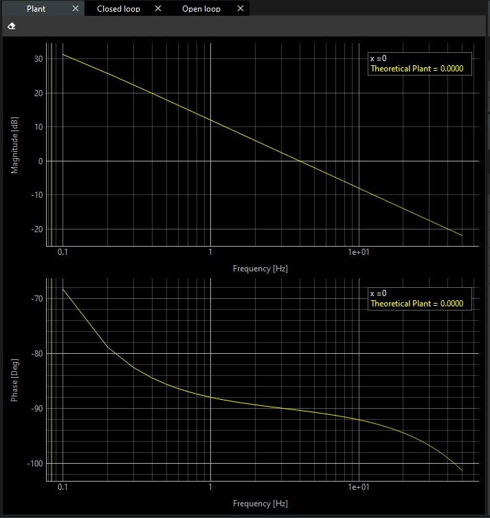 If the plant is created successfully, the theoretical plots in the magnitude and phase charts in the frequency domain are presented based on the theoretical inertia and friction.