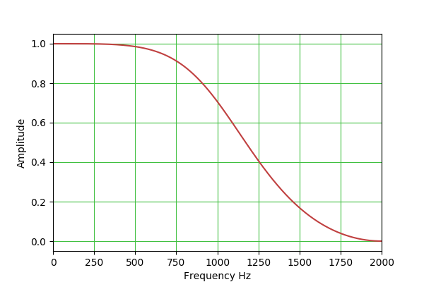 Attenuates frequencies higher than the cutoff frequency. The response of the filter can be dampened or made more aggressive (maybe causing resonance) by means of the quality factor. In this example, the cutoff frequency is 1000 Hz