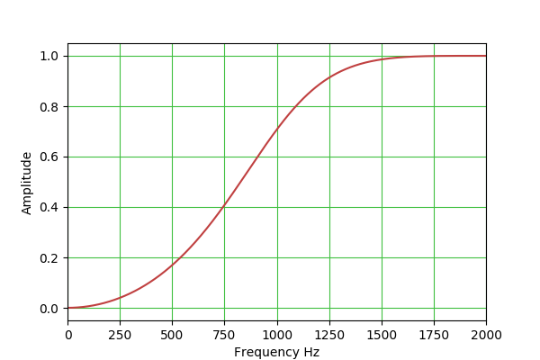 Amplifies frequencies higher than the center frequency. In this example, the center frequency is 1000 Hz.