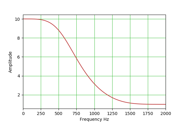 Amplifies frequencies lower than the center frequency. In this example, the center frequency is 1000 Hz.