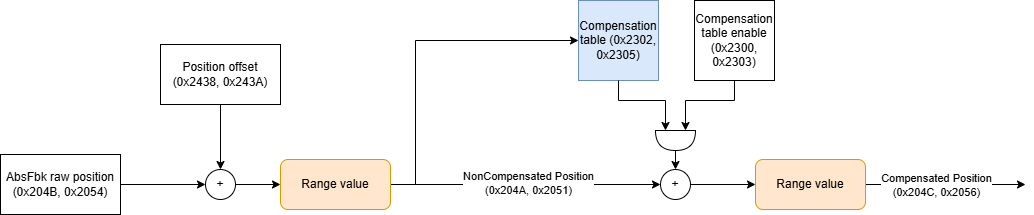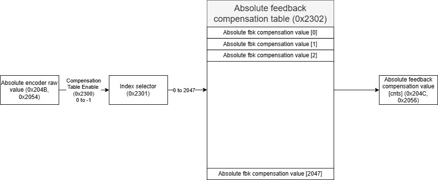 Absolute feedback compensation is a LUT (Look-up table) that uses feedback position as a selector of the index. The values from the table are applied as an offset in the output of the selected absolute feedback (primary or secondary) by the user.