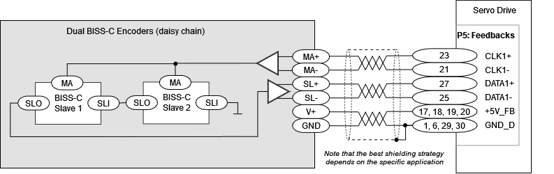 For dual daisy-chain BISS-C use the following connection. Dual BISS-C can be used for redundancy or to read the position of the rotor before and after a gearbox. Further details on this interface can be found here Primary Absolute Slave 2 (daisy chain).