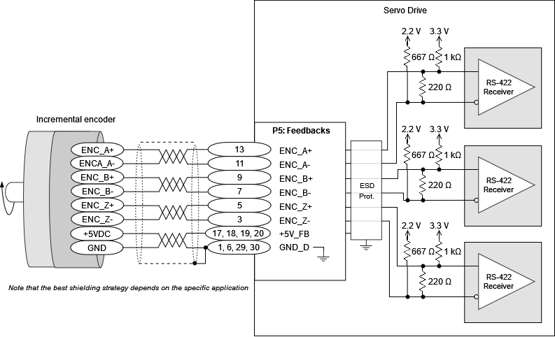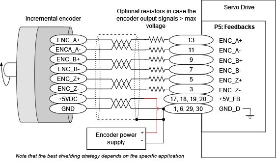 In the case that the encoder has a current consumption higher than 400 mA (maximum current output of the +5V_FB pin of the Servo Drive) or that the encoder has an input supply > 5 V, an external power supply will need to be used in order to power the encoder and in this case some wiring changes need to be taken into account (this applies to both the differential and single-ended encoders, both incremental and absolute):