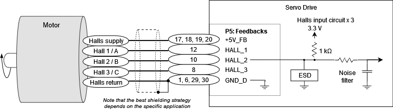 Next figure illustrates how to connect the digital Halls to the Servo Drive and a simplified input schematic.