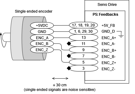 The wiring of a single-ended encoder to the Servo Drive is shown next: