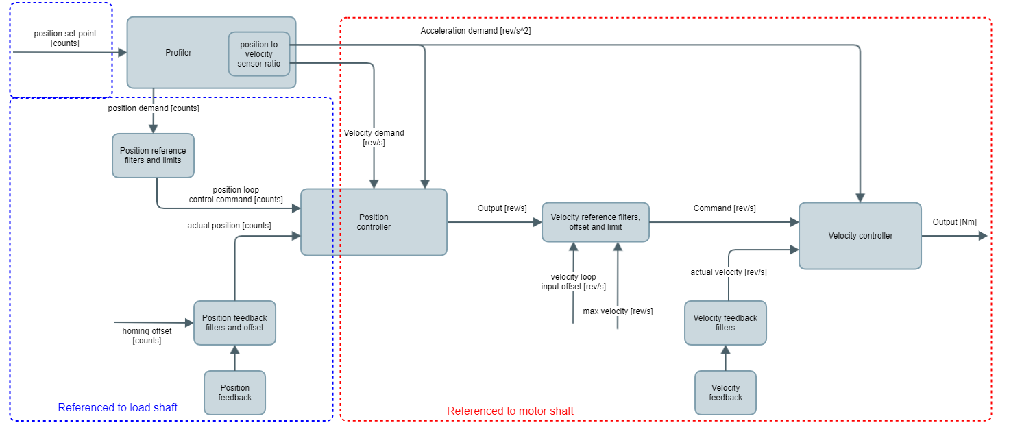 The register position to velocity sensor ratio is used inside the Profiler module. The position-velocity cascade control loop schema is the following one: