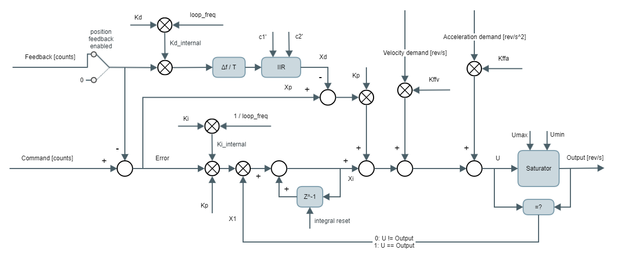 Kp, Ki and Kd are the PID gains. Kp in [(rev/s)/counts], Ki in [Hz] and Kd in [s2].