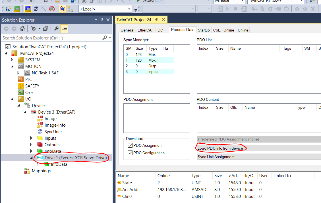 Inside Process Data tab, if thereisn't any information about PDO, click on Load PDO info from device