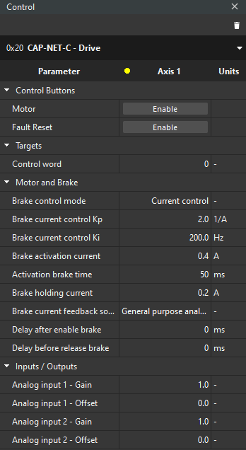 Tip: Start the tuning without activation current by setting Activation brake time → 0 ms so the drive commands only the holding current. Delay after enable and the Delay before release brake should also be set to 0 ms. Without these features, configuring the Brake current control Kp and Brake current control Ki to tune the control loop will be easier. The remaining parameters can be adjusted once the control loop is tuned.