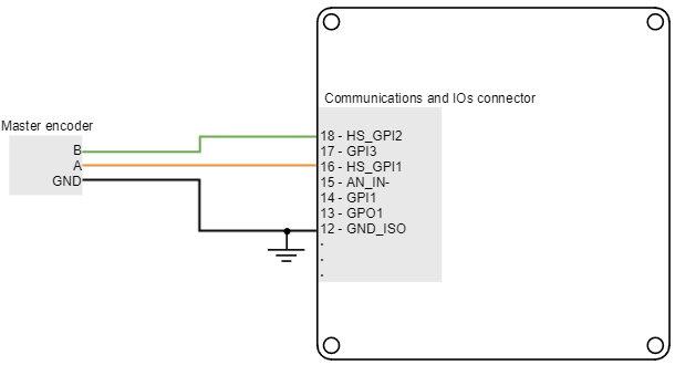 Encoder following command source is implemented by connecting the input encoder (auxiliary encoder of the master motor) to high-speed digital inputs (HS_GPI). Encoder channel A must be connected to high speed digital input 1, and channel B to high speed digital input 2. Connection examples for the differential and single ended master encoders are shown in the next figures:
