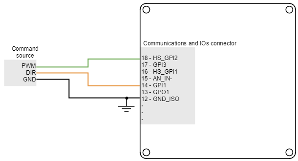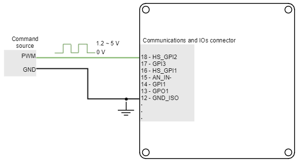 PWM command source sets a position, velocity or torque target from the duty cycle value of a PWM signal. PWM command has to be interfaced with the high-speed digital input 2 (HS_GPI2). Further details about this input can be seen in I/O Connections page. PWM command sources with single and dual input modes can be used.