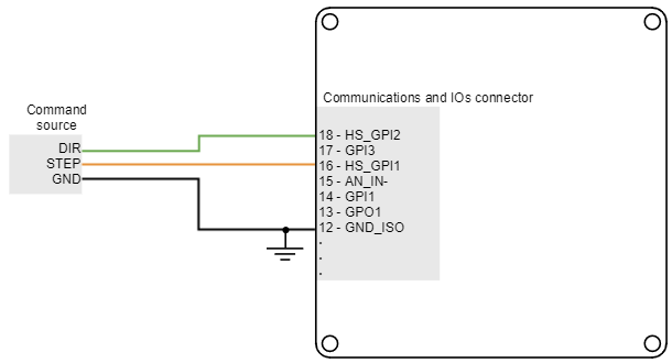 This command source is interfaced through high-speed digital inputs. HS_GPI1 is used for Step input, and HS_GPI2 is used for Direction input. Refer to I/O Connections for further specifications about high-speed digital inputs. Next figures illustrate how to connect a single ended step and direction command source to the Titan Go Servo Drive.