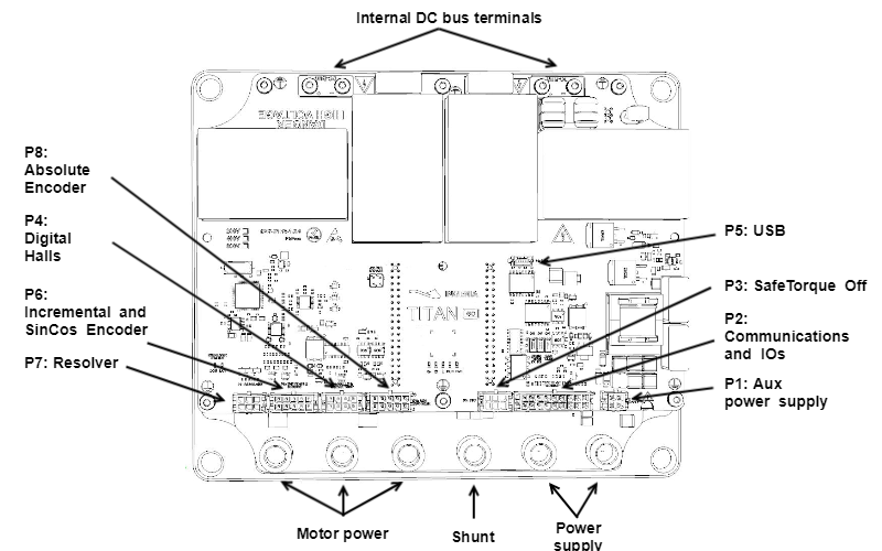| 8, 10 | DC_BUS+ | Internal DC bus positive. Not intended as power supply terminal. Used for additional DC link capacitance. Titan includes an internal capacitor soft precharge circuit, removing the need for external precharge relays. | |