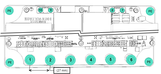 1 to 6: M8 female terminal, 27 mm pitch. ERNI 225872. 7 to 10: M3 torx screw terminal. PE holes: 9 mm diameter. | |||