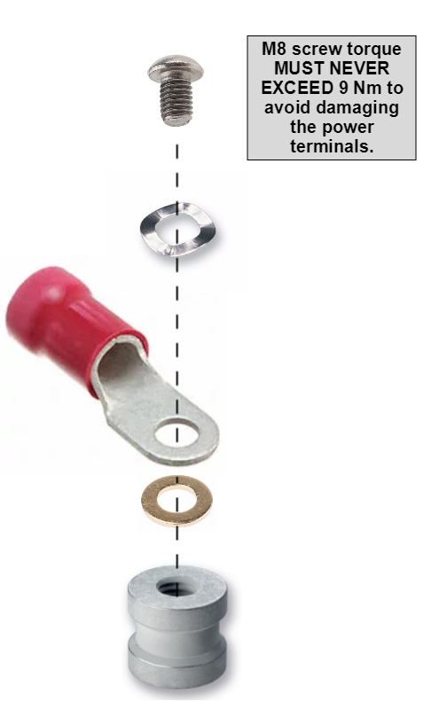 Due to the high current ratings, ring terminals and screws are needed for the power terrminals. Following are shown the recommended part numbers.
