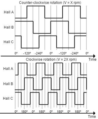 The Hall sensors are Hall effect devices that are built into the motor to detect the position of the rotor magnetic field. Usually, motors include 3 hall sensors, spaced 120º apart. Using these 3 signals, the drive is capable to detect the position, direction and velocity of the rotor. Next figures show examples of digital halls signals.