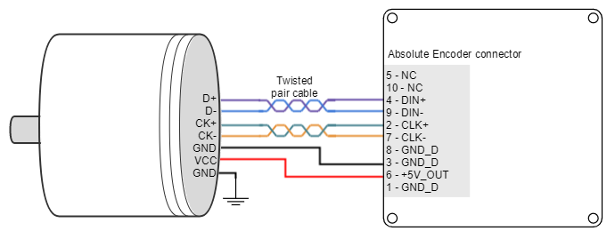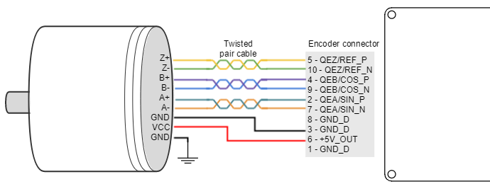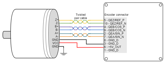 - Use differential signals whenever is possible. That is, connect both positive and negative signals of differential feedback sensors. Use a twisted pair for each differential group of signals and another twisted pair for the +5 V supply and GND. Twisted-pairs help in elimination of noise because disturbances induced in twisted pairs