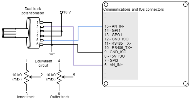 The following picture shows how to connect a potentiometer as a position sensor using analog input 1: