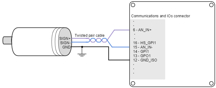 Titan Go Servo Drive can also use analog feedback systems connected through the Communications and IOs connector. From the voltage level of one analog input, the position or velocity of the rotor can be calculated. The Titan Go have 1 differential analog input that can be used for feedback input, with a range of ±10 V. The input used as feedback can be selected by software.