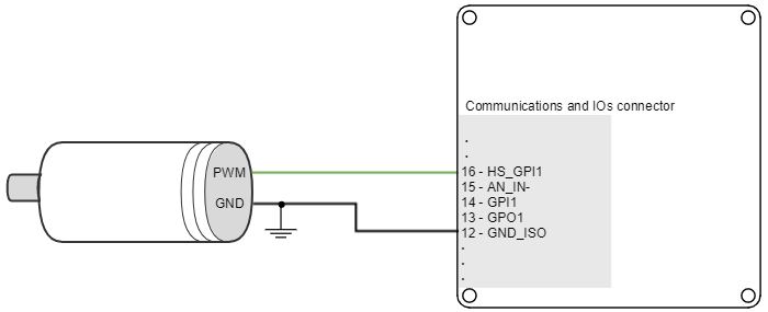 Titan Go Servo Drive can also use a PWM encoder connected through the Communications and IOs connector as a feedback element. A PWM encoder provides a Pulse Width Modulated (PWM) signal with a duty cycle proportional to the angle (position) of the rotor. This feedback can be interfaced through the high-speed digital input 1 (HS_GPI1). Only single ended encoders can be used. Further specifications about the PWM input can be found in I/O connection section.